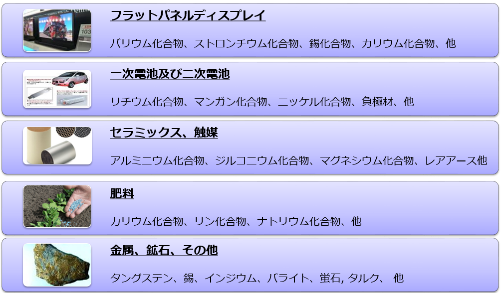 当部概要 当部の機能 事業領域 Global supply chain ディスプレイ原料からスタートした当部は、既存顧客への新規商材の販売、既存商材の新規顧客への販売を繰り返し、電池や触媒、電子材料といった高付加価値品から、肥料や合金といった汎用品まで幅広く事業領域を拡大しております。