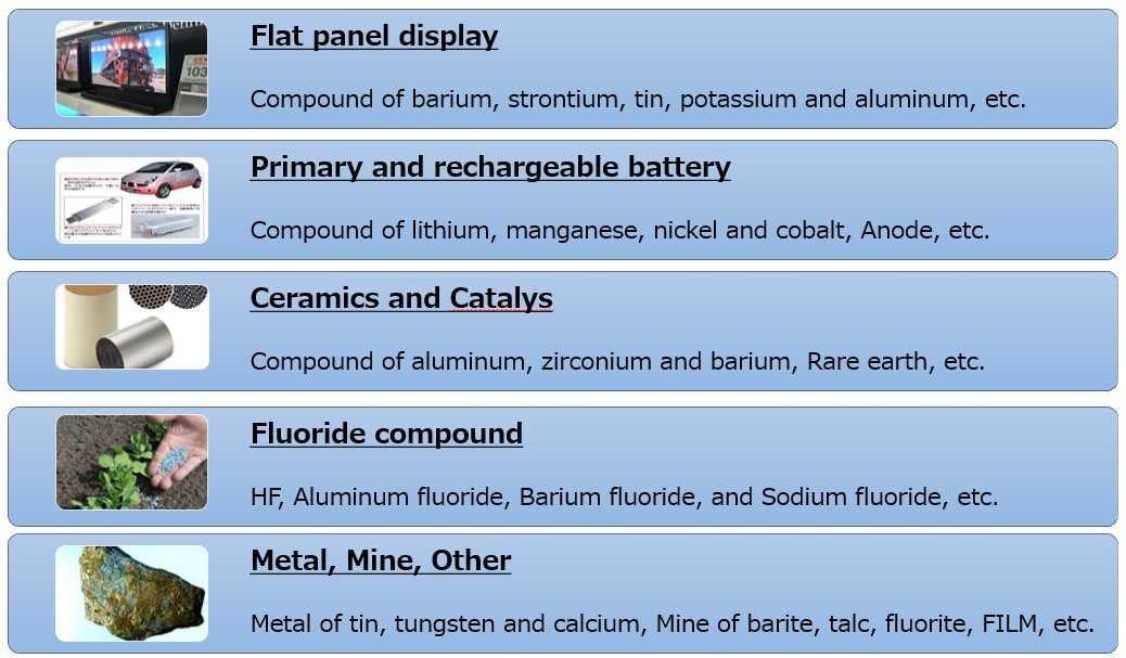 We, who started from display raw materials business, are expanding our business field widely from high value-added products such as batteries, catalysts, and electronic materials to general-purpose products such as fertilizers and alloys.