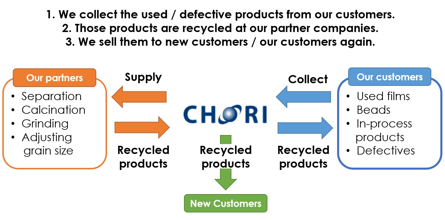 We collect used bead products for crushing or dispersing (zirconia, alumina, etc.), recycle them at our cooperating companies, and sell them to new customers. Furthermore, we are developing the business by collecting the ceramic molding films, and reusing them after the separation of the molded products and the films.