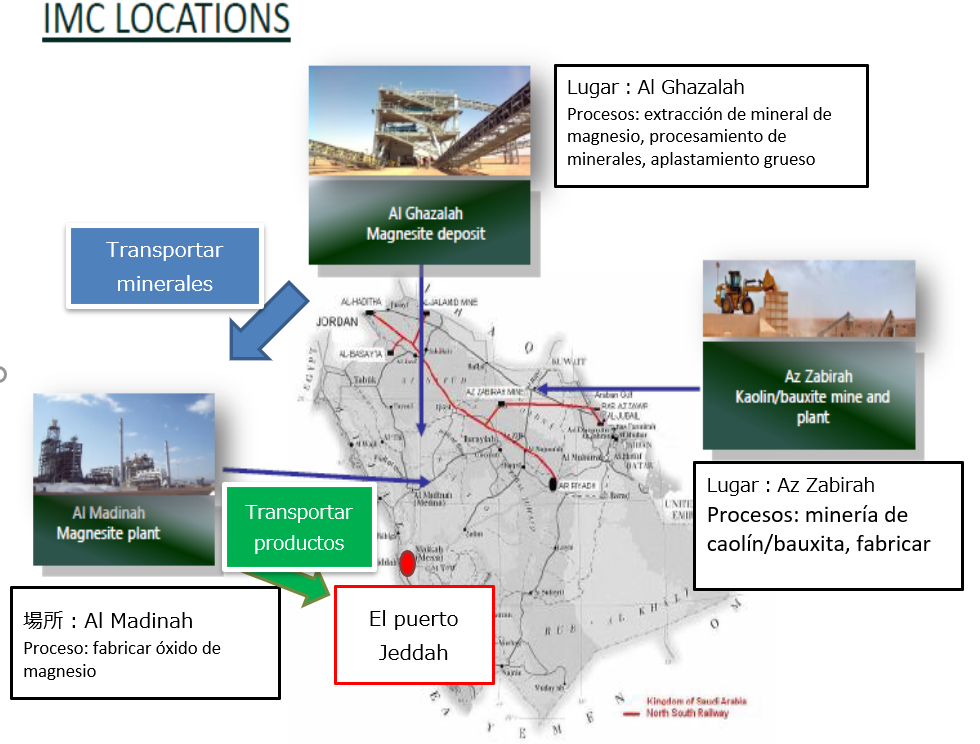 La empresa IMC tiene una fábrica de óxido de magnesio en “Medina”, que se queda en la parte oxidental de Arabia Saudita y es el segundo santuario de los musulmánes después de la meca. Esa fábrica se queda 300km al norte de Jeddah que es el puerto principal, y 400km al sur de Ghazalah donde se queda la mina.