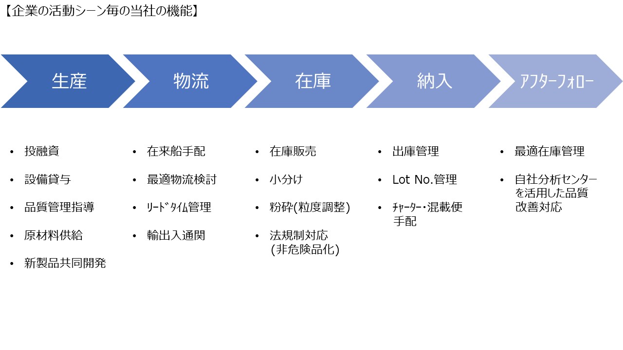 それら製品の輸出入だけでなく、これまでの40年以上に及ぶ事業の経験と取引先との強固な信頼関係を活かし、国内外で多岐にわたるサービスを付加し、お客様へお届けしております。