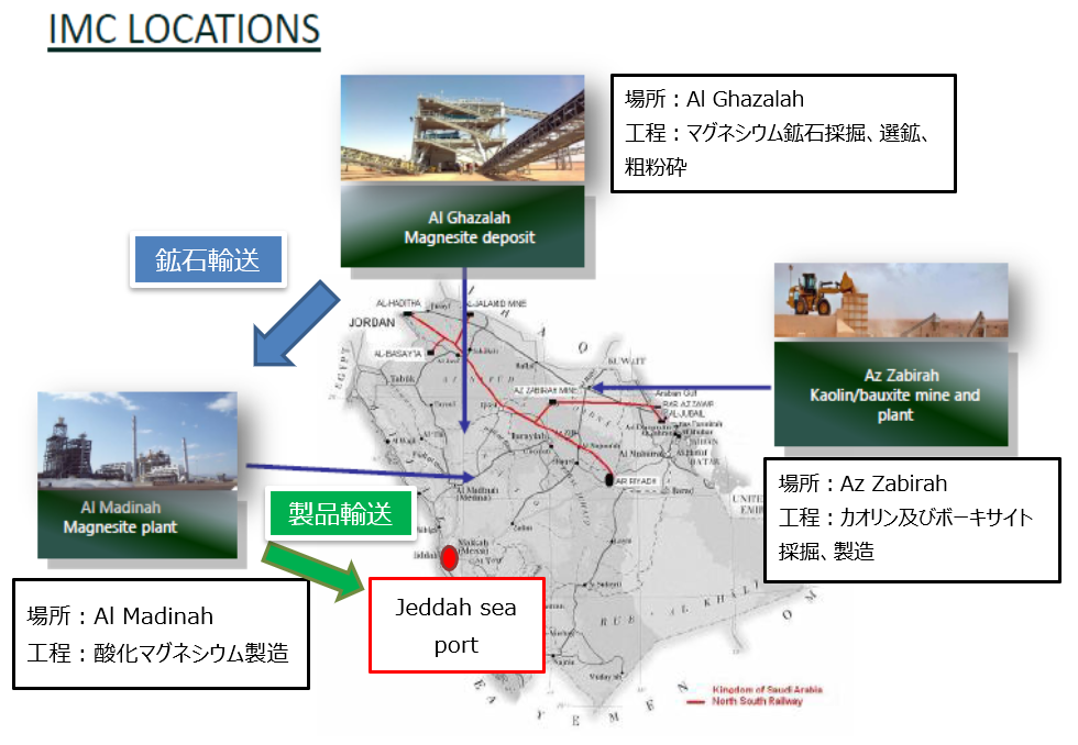 当部が取り扱う酸化マグネシウムは、サウジアラビア西部、メッカに次ぐイスラム教徒の第2の聖地である「メディナ」に工場を保有しています。主要港であるジェッダからは北に300km、鉱山のあるGhazalahからは南に400㎞の場所に位置しています。