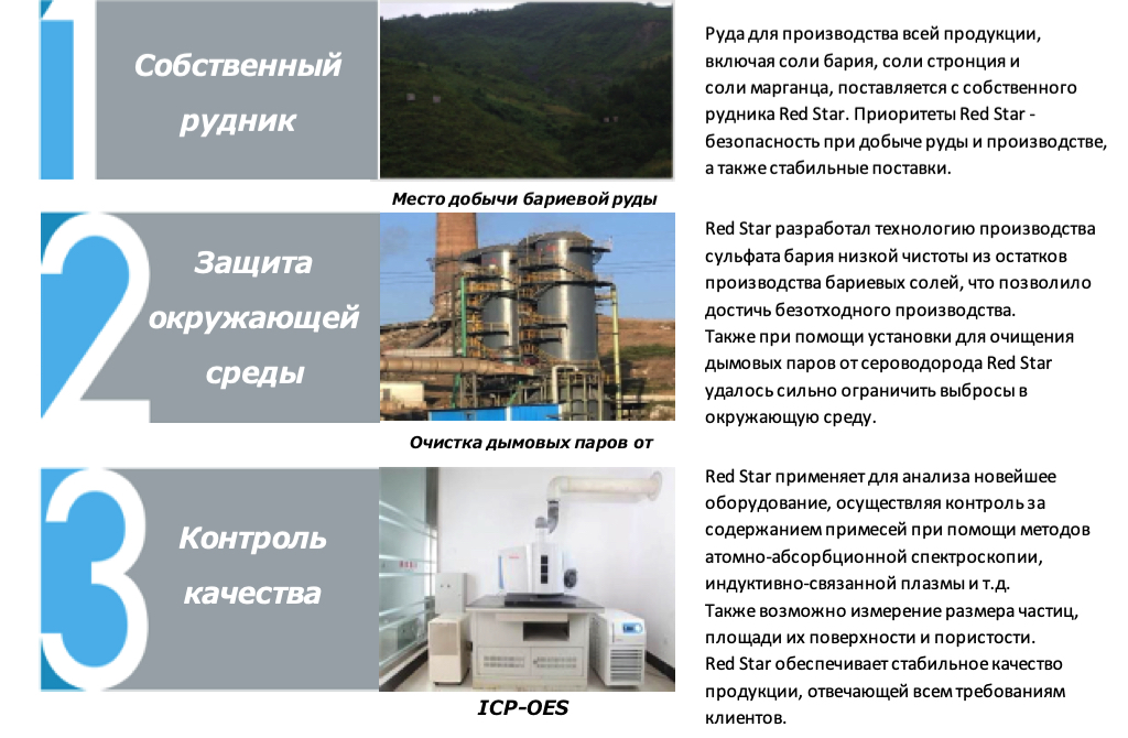 История группы компаний Red Star началась с завода Qingdao Taidong Chemical Plant в 1956 г. Сейчас Red Star является самым крупным производителем солей бария в мире, самым крупным производителем солей стронция в Азии, и третьим по масштабу в мире производителем солей марганца. Кроме того, Red Star — один из первых китайских производителей, кто сосредоточил внимание на защите окружающей среды и создал производственную цепочку, основанную на таких технологиях, как очистка дымовых газов от сероводорода. Благодаря этому даже сейчас, когда в Китае были введены строгие ограничения для защиты окружающей среды, Red Star продолжает осуществлять стабильные поставки своей продукции, удовлетворяя любые потребности клиентов.