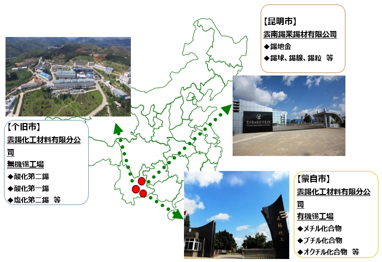 雲南錫業グループと当社は2008年に雲南錫業100%出資子会社の雲錫(香港)資源有限公司と全世界向け液晶基板ガラス用途での独占総代理店契約締結致しました。その後、2018年には日本向け、はんだ・錫化工品用途での総代理店契約締結し、日本国内で在庫販売を開始しました。また、これ以外にも有機錫化合物の取り組みも拡大し、錫関連製品の総合窓口として関係を強化しています。